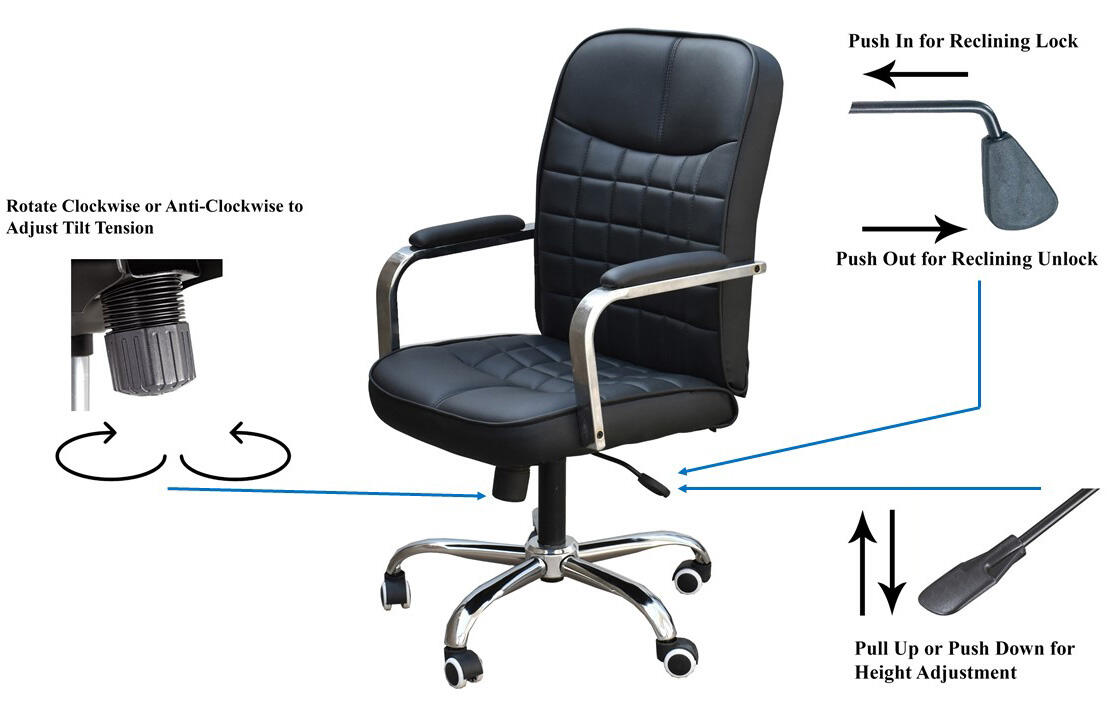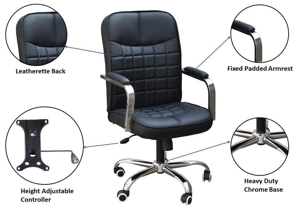 - Chrome finish base ensures stability and provides strength to the overall chair. The five castor wheels along with 360 degree swivel mechanism provide flexibility and a versatile range of motion. The knob at the base can be turned clockwise or anti-clockwise to adjust tilt tension.