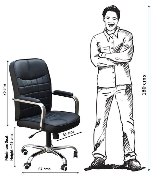 - Width – 51 cms, Depth – 54 cms, Minimum Height – 125 cms, Maximum Height – 133 cms. Material – Leatherette cushioned seat & Chrome finish base. 360 degree swivel mechanism with pneumatic gaslift for height adjustment.