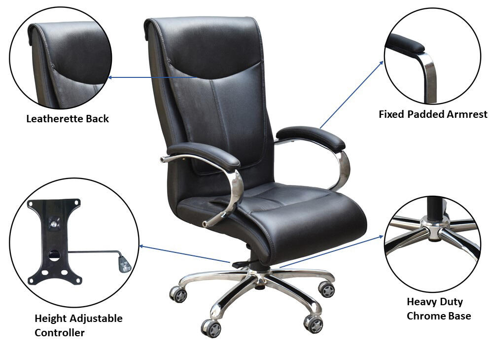 - Chrome finish base ensures stability and provides strength to the overall chair. The five castor wheels along with 360 degree swivel mechanism provide flexibility and a versatile range of motion. The knob at the base can be turned clockwise or anti-clockwise to adjust tilt tension.