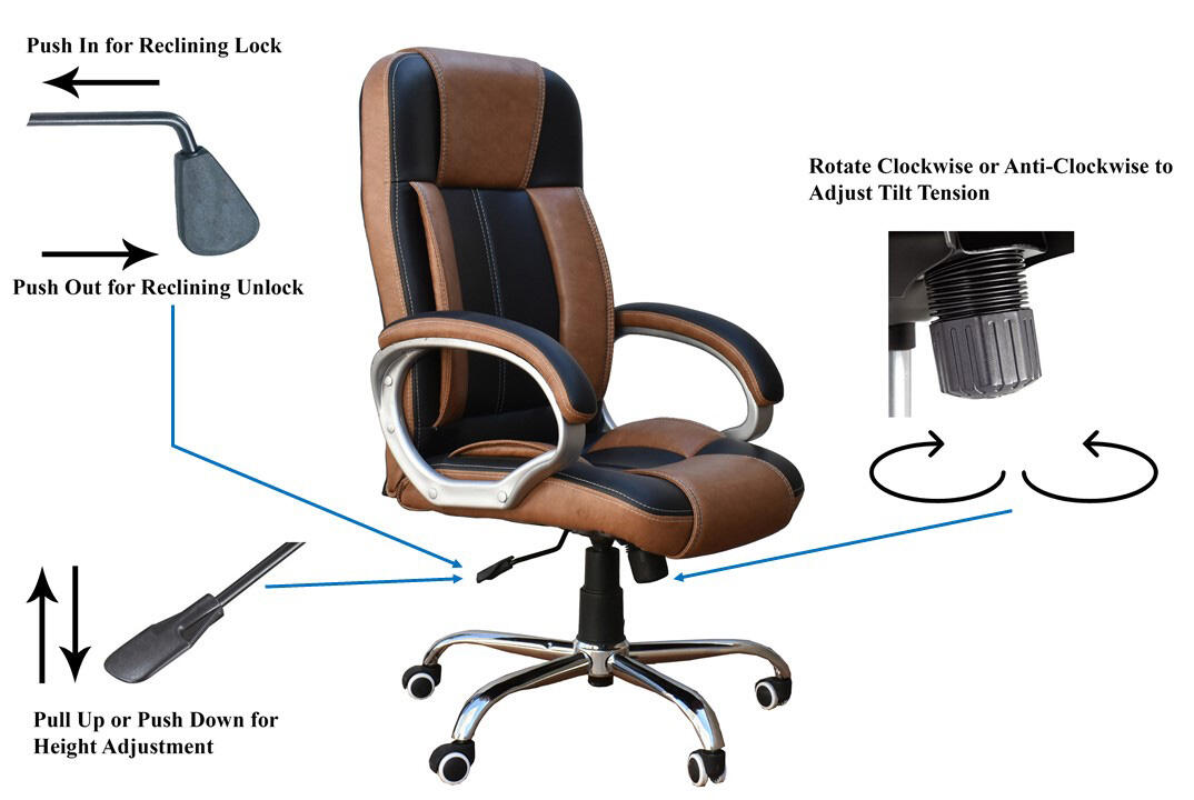 - Chrome finish base ensures stability and provides strength to the overall chair. The five castor wheels along with 360 degree swivel mechanism provide flexibility and a versatile range of motion. The knob at the base can be turned clockwise or anti-clockwise to adjust tilt tension.