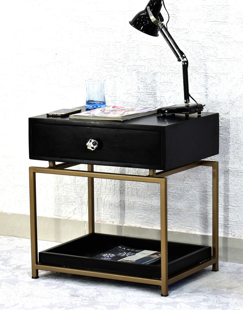 The top of the side table and the tray at the bottom are made from solid mango wood with black finish. The frame is made from iron with golden finish. It has a wide variety of applications. It can easily be used as a bedside table for keeping small items like chargers, phones, water bottle, mugs, glasses, spectacles, etc. The one drawer provides ample storage for storing small valuable items like keys, wallet, etc. Its small and compact design perfectly blends with and complements any kind of décor.