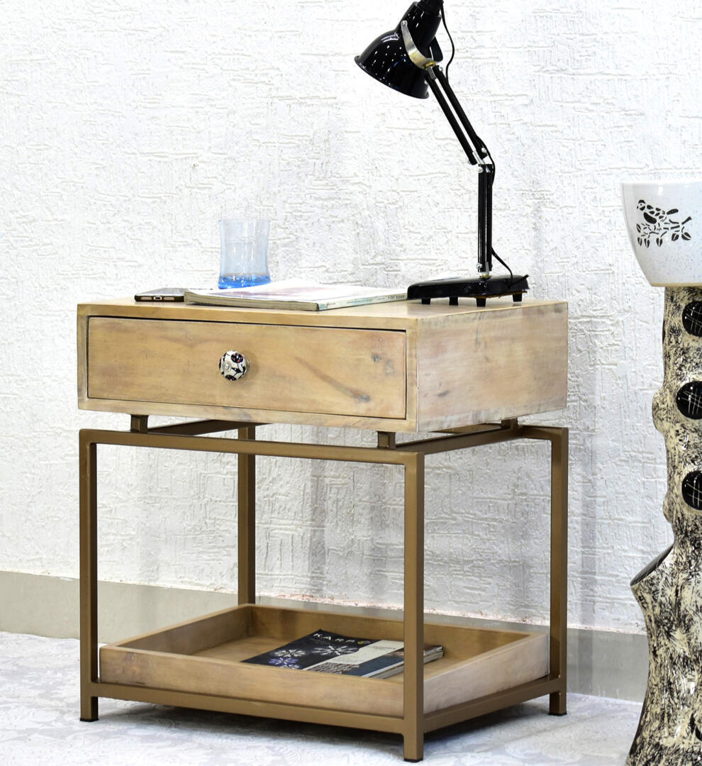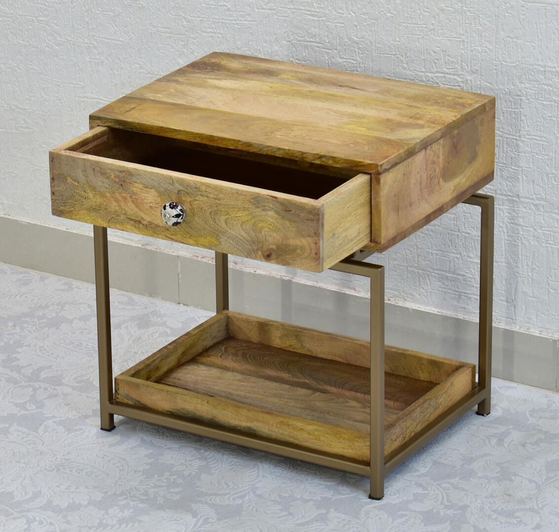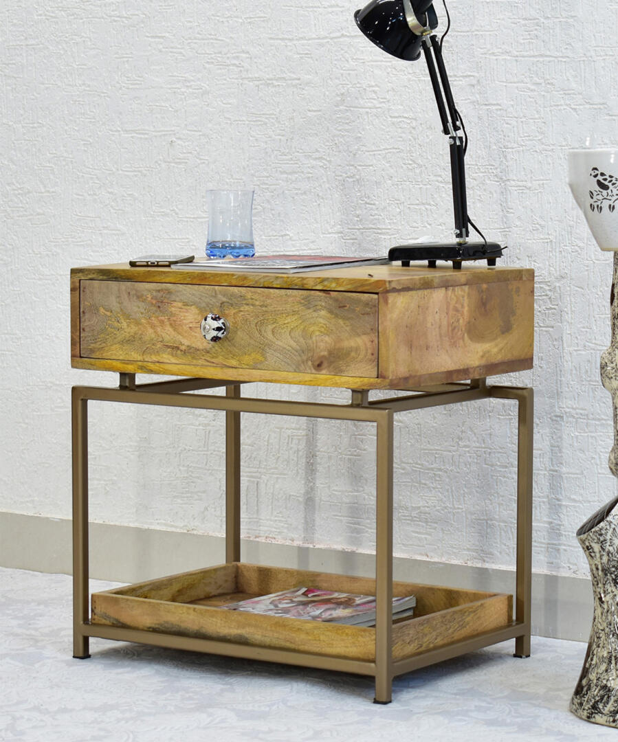 - This side table made from solid mango wood can be used as a bedside table for keeping small items like chargers, phones, water bottle, mugs, etc. The one drawer provides ample storage for storing small valuable items like keys, wallet, etc. The tray at the bottom provides space and storage for magazines or small bottles.