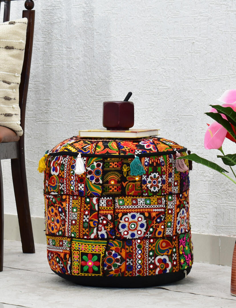- This multipurpose pouffe/ottoman with Gujrati Rajmodi patch work in Black adds colour & vibrance to your décor. Gujrati Rajmodi Art is known for its intricate patchwork design. So every pouffe has unique patchwork but follows the basic design methodology. So no two pouffes are exactly same but they very well complement each other.