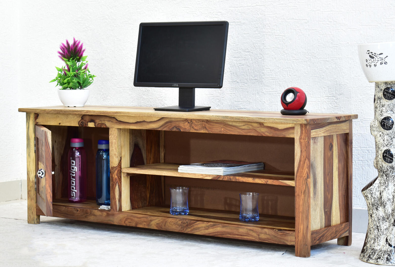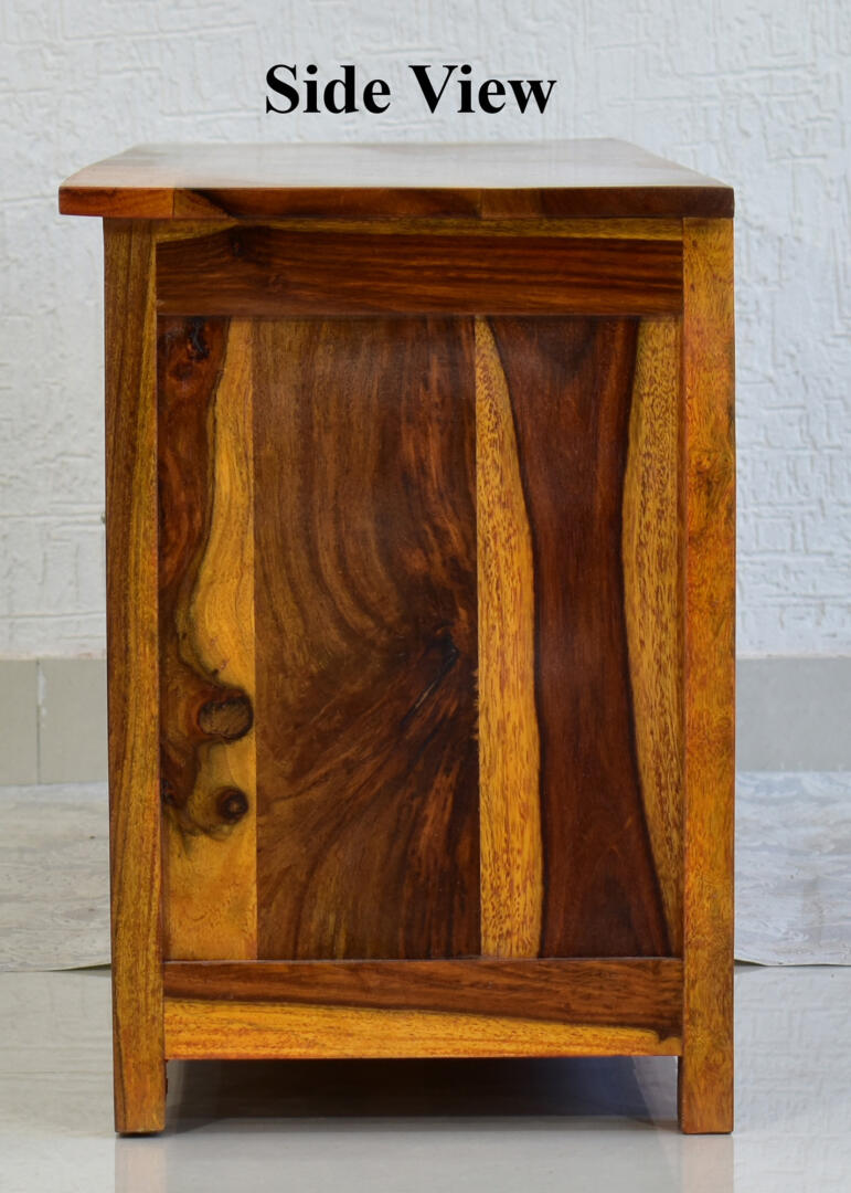 - Width – 145 cms, Depth – 35 cms, Height – 50 cms. Material – Solid Sheesham Wood. Finish – Lacquer Finish. Weight – Approx 31 kgs. The partition shelf is removable providing flexibility and ease of storage.