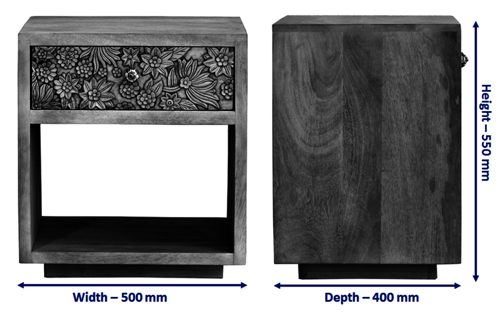 - Width – 50 cms, Depth – 40 cms, Height – 55 cms. Material – Solid Mango Wood in White finish. Hand Carving on the face of the drawer. The drawer is not on Runner but on Wooden Sleeves.