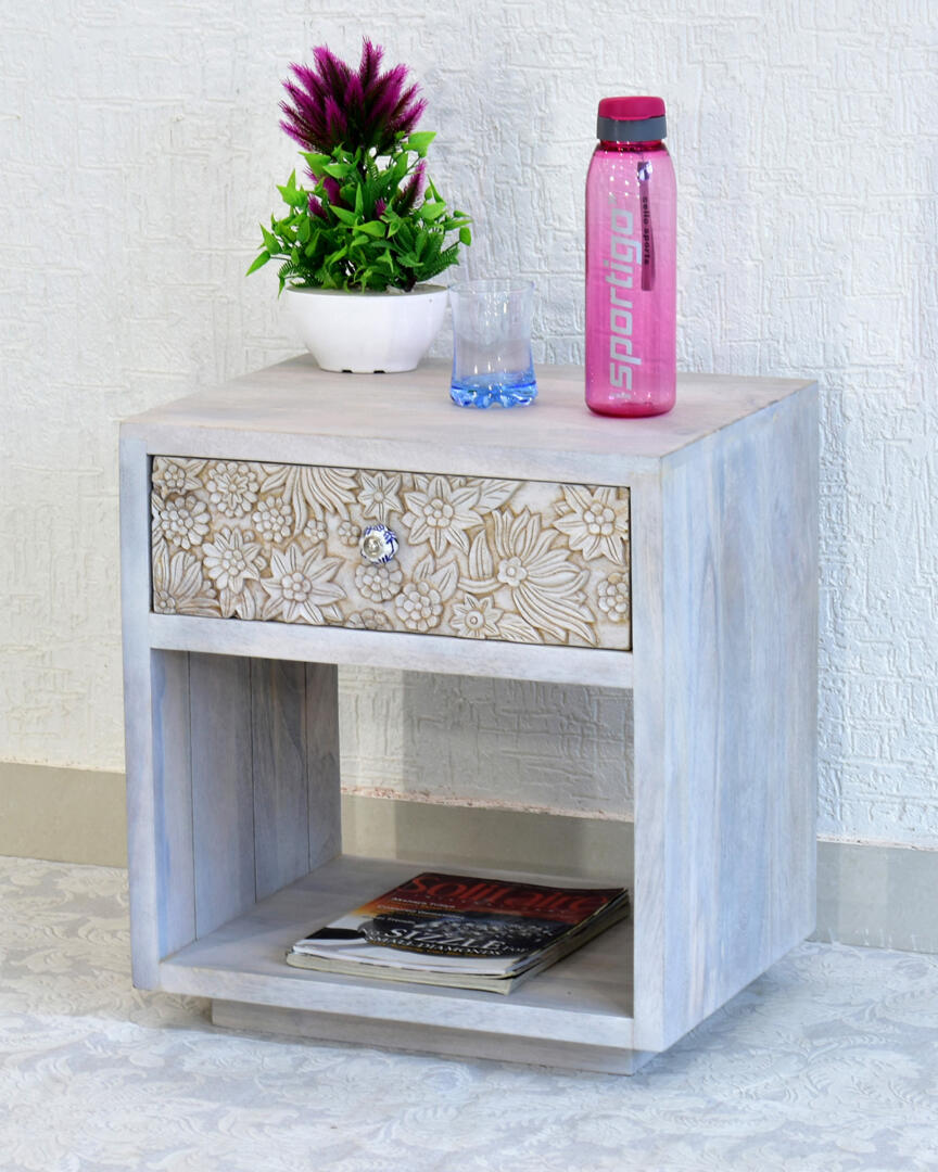 - This side table made from solid mango wood can be used as a bedside table for keeping small items like chargers, phones, water bottle, mugs, etc. The one drawer provides ample storage for storing small valuable items like keys, wallet, etc.