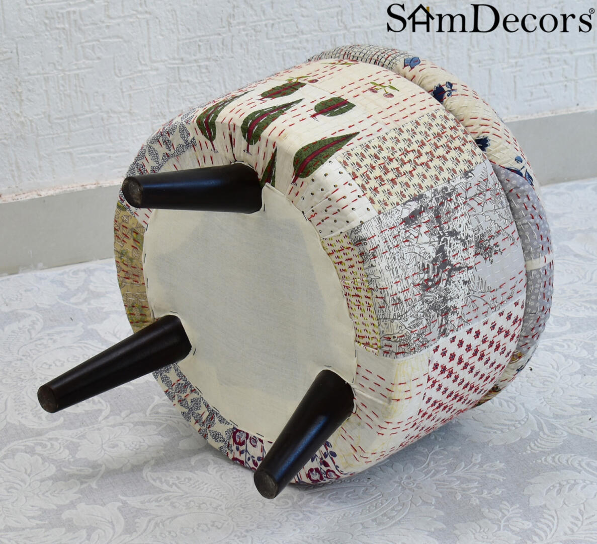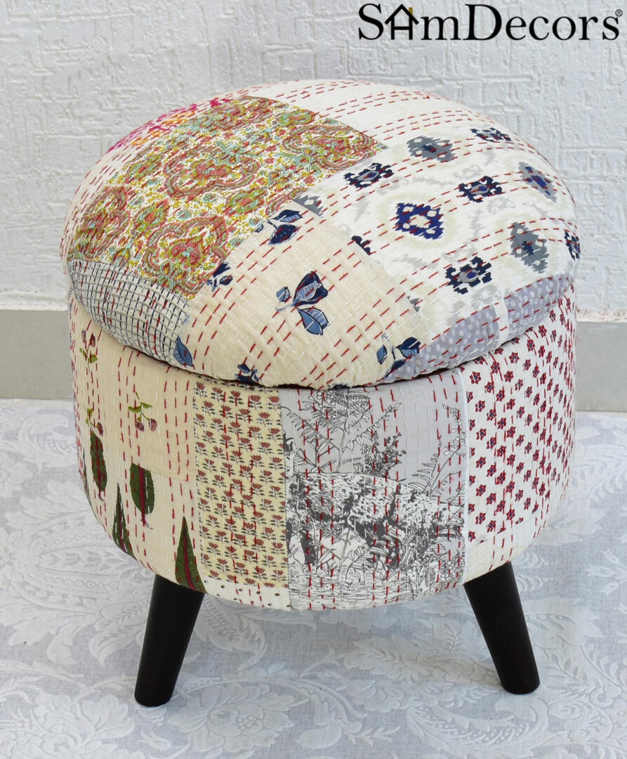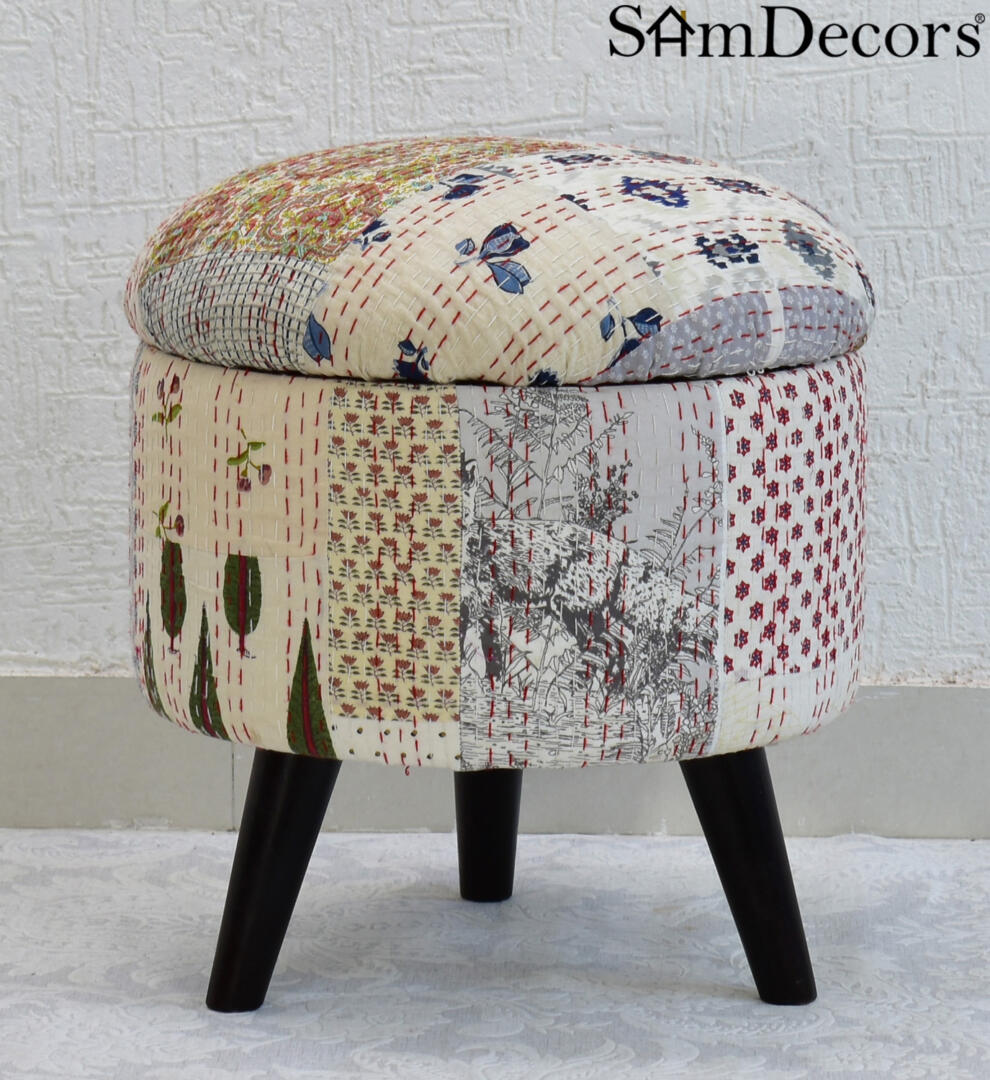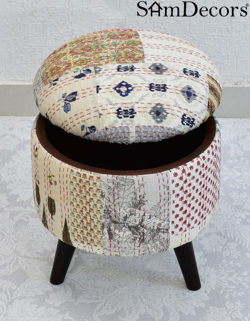 Bring colour & texture into your home with this pouffe/ottoman/three leg stool. It serves as an extra seating arrangement for your living and dining spaces. Perfect for reading, meditating, or just relaxing on. Easily mix and match your curtains, bedlinen, upholstery and furnishing to accent every room. The speciality of Printed Kantha Gudri Patchwork Art is that every piece is unique due to its Patchwork Design methodology. So no two are exactly similar but they belong to the same family, so they very well complement each other. The hollow compartment provides extra storage space.