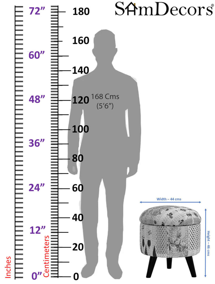• Width – 44 cms, Depth – 44 cms, Height – 46 cms. Outer Material – Patchwork. Style – Printed Kantha Gudri Patchwork in White. Weight – 7 kgs