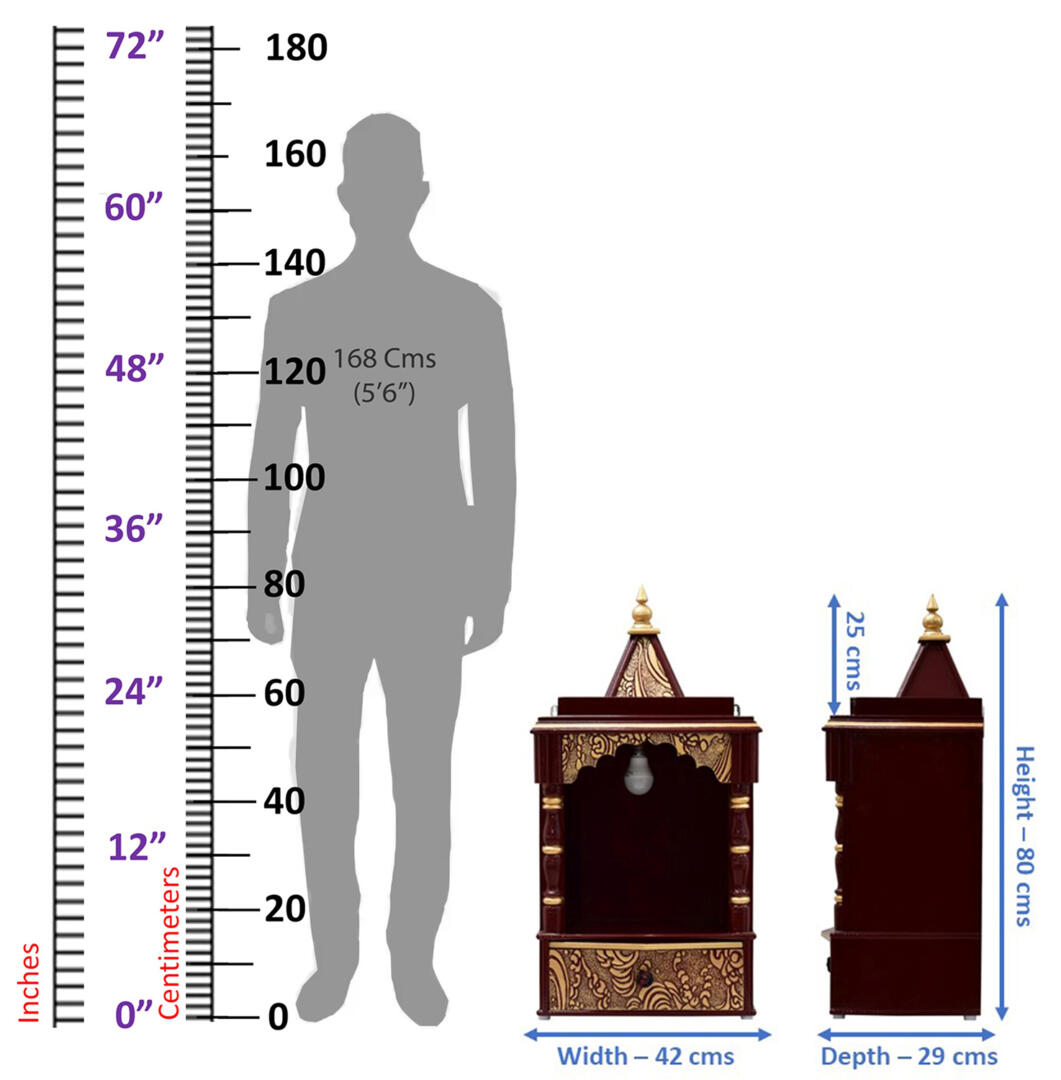- This pooja mandir/temple made from engineered wood is ideal for small offices, homes, shops, etc. Brown finish goes with any kind of décor and also gives a very auspicious and sacred feeling. Golden highlights give it a modern yet traditional look.