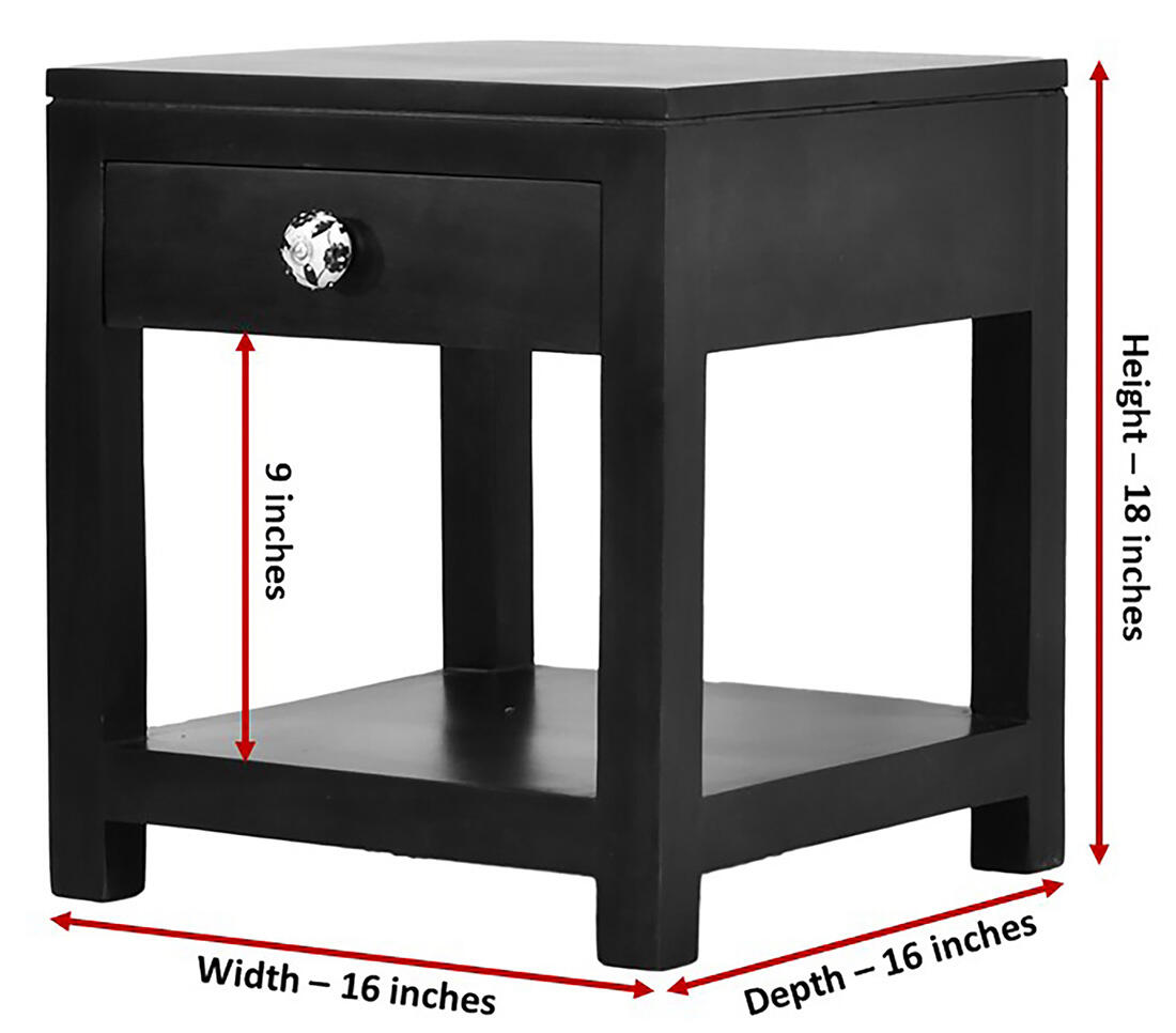• Width – 16 inches, Depth – 16 inches, Height – 18 inches. Material – Solid Sheesham Wood. Finish – Lacquer Finish, Dark Walnut. Colour – Dark Brown. Weight – Approx 11 kgs. The drawer is not on runner but on wooden sleeves.